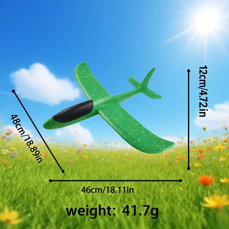 Get ready for hours of high-flying excitement ✨ with our large hand-throw foam glider! This toy is the perfect way to encourage outdoor play 🌳 and physical activity for children. Made from a lightweight yet durable foam material, it's designed to soar through the air with ease 🌬️, performing long glides and fun tricks.