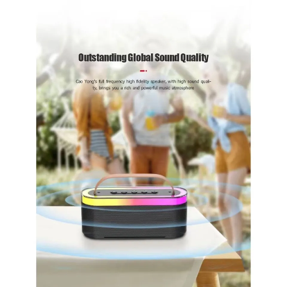 Stylish and powerful portable Bluetooth speaker with RGB lighting, stereo sound, multiple playback options, and 1500mAh battery.