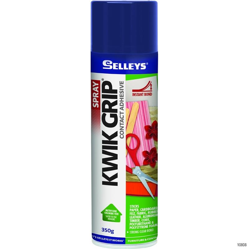 Selleys Kwik Grip® Spray is a clear fast drying, spray adhesive that forms an instant bond on contact of two sprayed surfaces. The spray application allows for a fine film of adhesive to be applied across surfaces. It dries colorless and produces a durable bond on both adsorbent and non-absorbent surfaces.