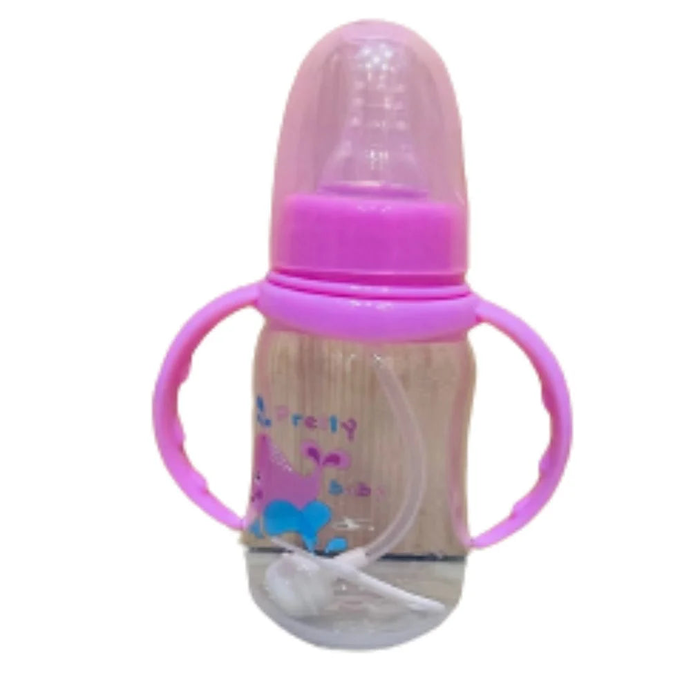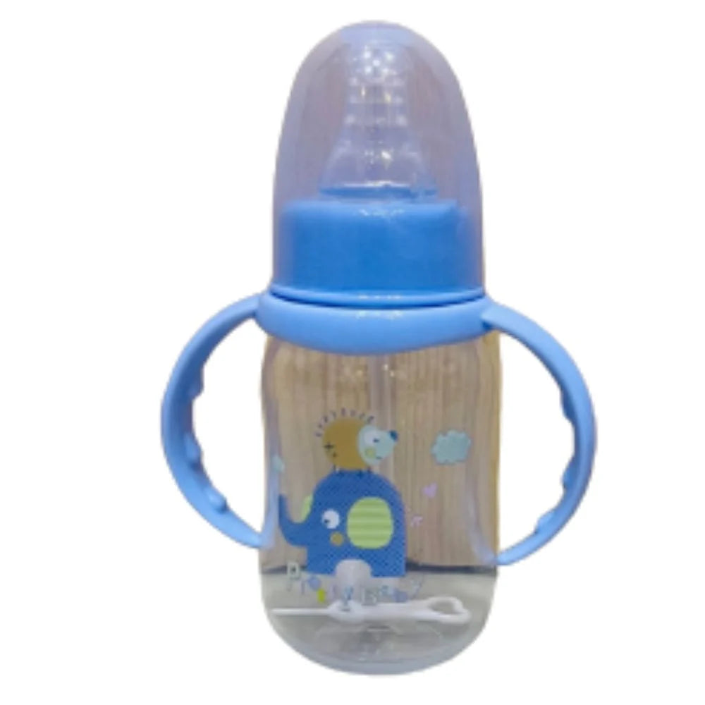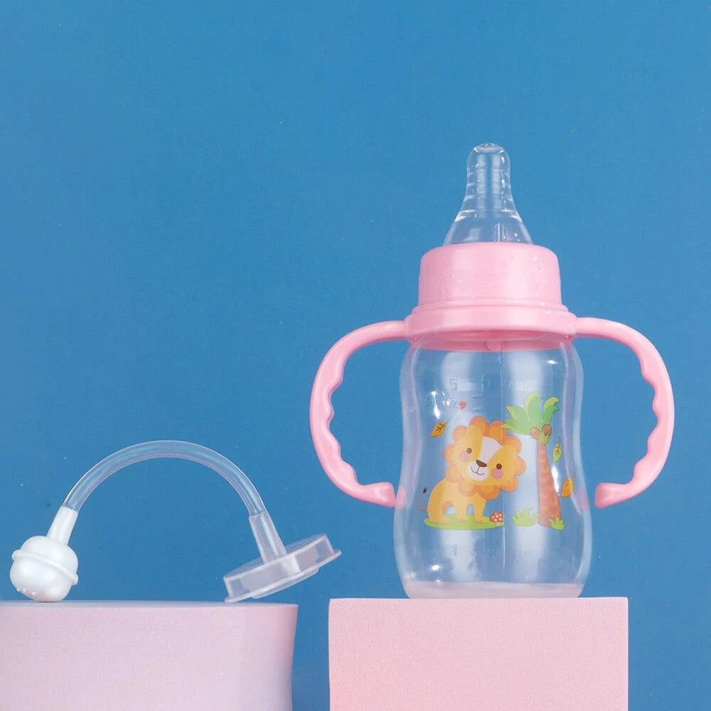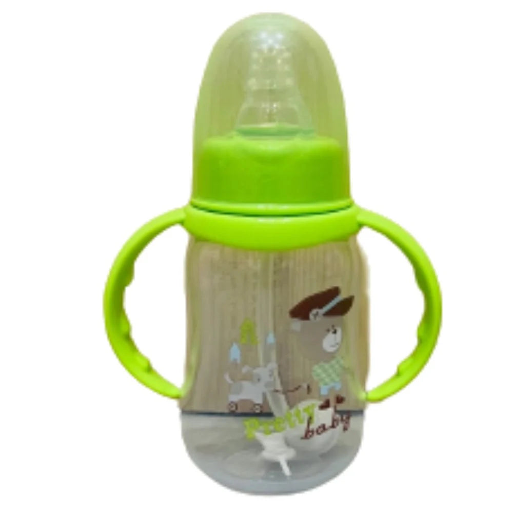 பிபிஏ அழகான குழந்தை இலவச இயற்கை உணவு பாட்டில் கைப்பிடியுடன் 150 மில்லி குழந்தை சாறு பால் தண்ணீர் ஊட்டுதல் டீட் பாட்டில்
