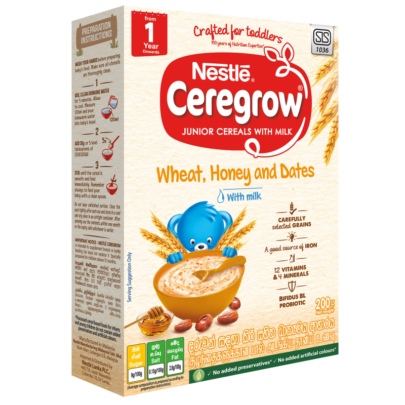 செரிக்ரோ கோதுமை, தேன் & பேரீச்சம்பழம் பாலுடன் 1 முதல் 3 வயது வரையிலான குழந்தைகளுக்கு ஒரு இளைய தானியமாகும். இது கோதுமை, தேன் மற்றும் பேரீச்சம்பழத்தின் இயற்கையான நன்மைகளுடன் முழுமையான ஒரு சுவையான மற்றும் அற்புதமான சுவையை வழங்குகிறது. உங்கள் குழந்தையின் நோய் எதிர்ப்பு சக்தியை வலுப்படுத்த உதவும் புரோபயாடிக்குகளால் (பிஃபிடஸ் பிஎல்) செறிவூட்டப்பட்ட சந்தையில் உள்ள ஒரே குழந்தை தானியம் இதுவாகும். பாலுடன் கூடிய செரிக்ரோ கோதுமை, தேன் & பேரீச்சம்பழம் இரும்பு, துத்தநாகம், வைட்டமின் ஏ, வைட்டமின் சி மற்றும் கால்சியம் ஆகியவற்றால் செறிவூட்டப்பட்டுள்ளது மற்றும் எந்த பாதுகாப்புகள் அல்லது செயற்கை வண்ணங்கள் சேர்க்கப்படவில்லை.
